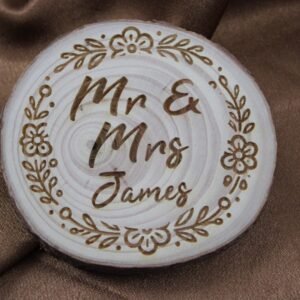Personalised Round Handmade Wedding/Engagement Favours Engraved Wood Slice Coaster
